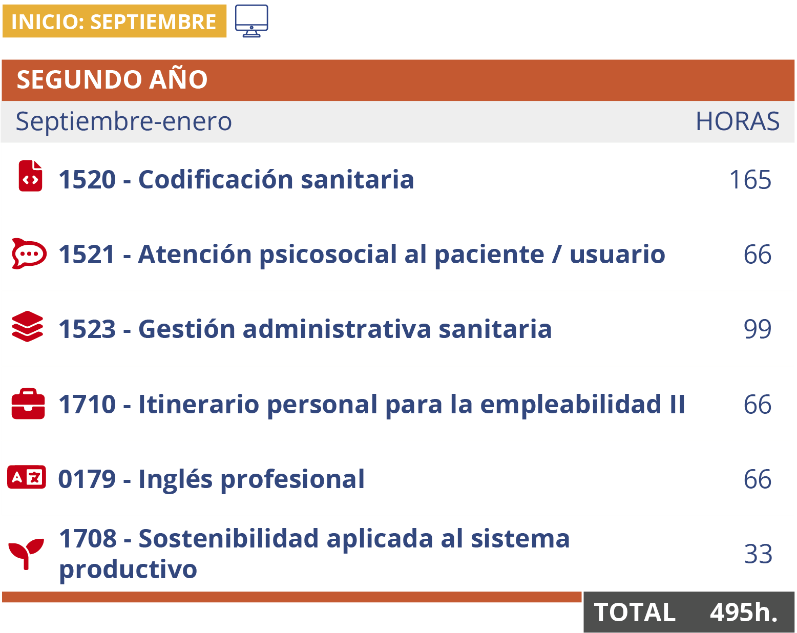 Además de la formación online, este ciclo formativo en Documentación y Administración Sanitarias también se puede cursar escogiendo otras modalidades. Por ello, disponemos de estas opciones: